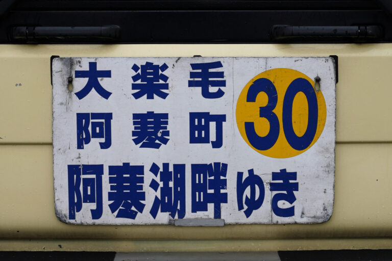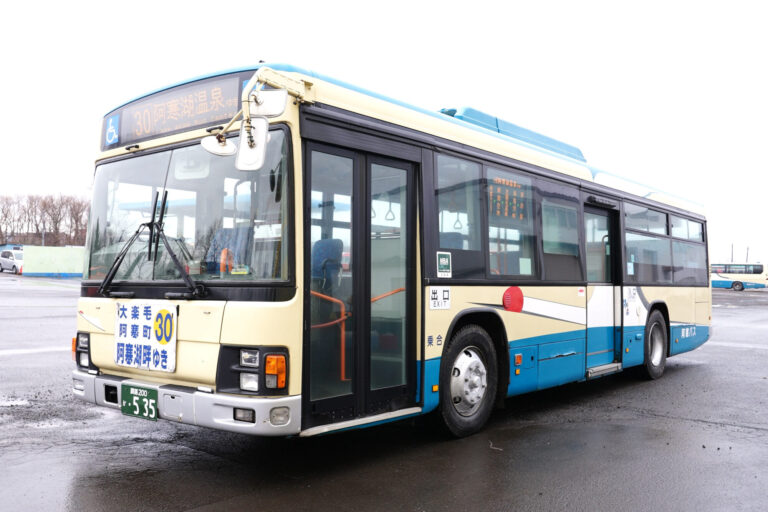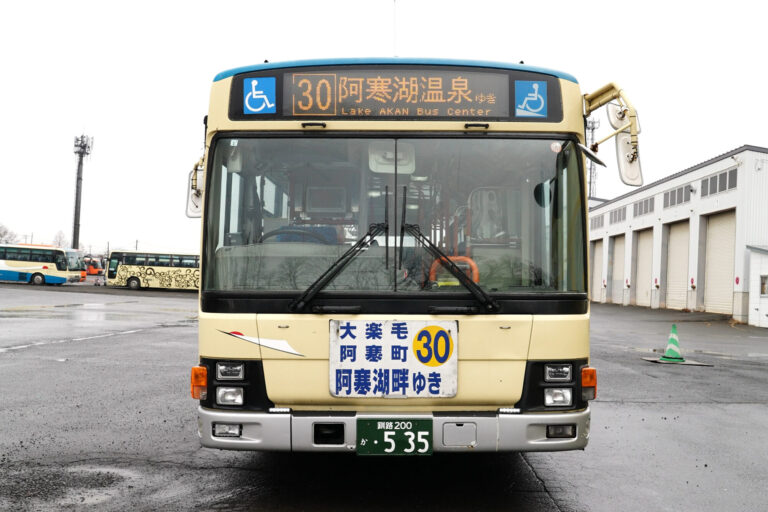「30 阿寒線」は通常の路線バスで、地元の方々も利用する生活路線です。バスの車体も路線バス仕様です。バス車両前方にヘッドマークを付けており、路線番号の「30」と表示されています(一部にヘッドマークがない車両もあります)。スーツケースなどの荷物は車両内に持ち込みます。座席の数が多くはないので、着席できずに立ったまま乗車することになる可能性があります。