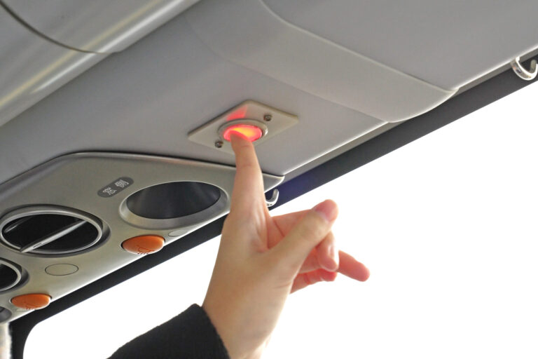 降車するバス停のアナウンスが流れましたら降車ボタンを押してください。このボタンは頭上の空調吹き出し口近くに設置されています。